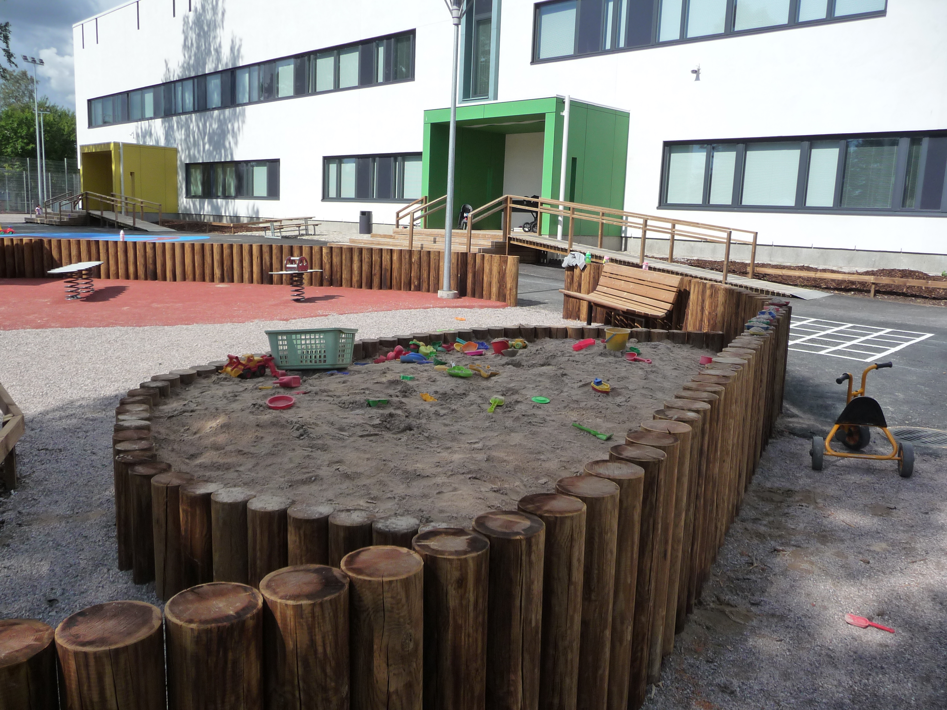 Korttelitaloon sijoittuvat sekä päiväkoti että ala-asteen koulu, joiden pihoille tuli paljon erilaisia toimintoja ja leikki-/pelivälineitä.